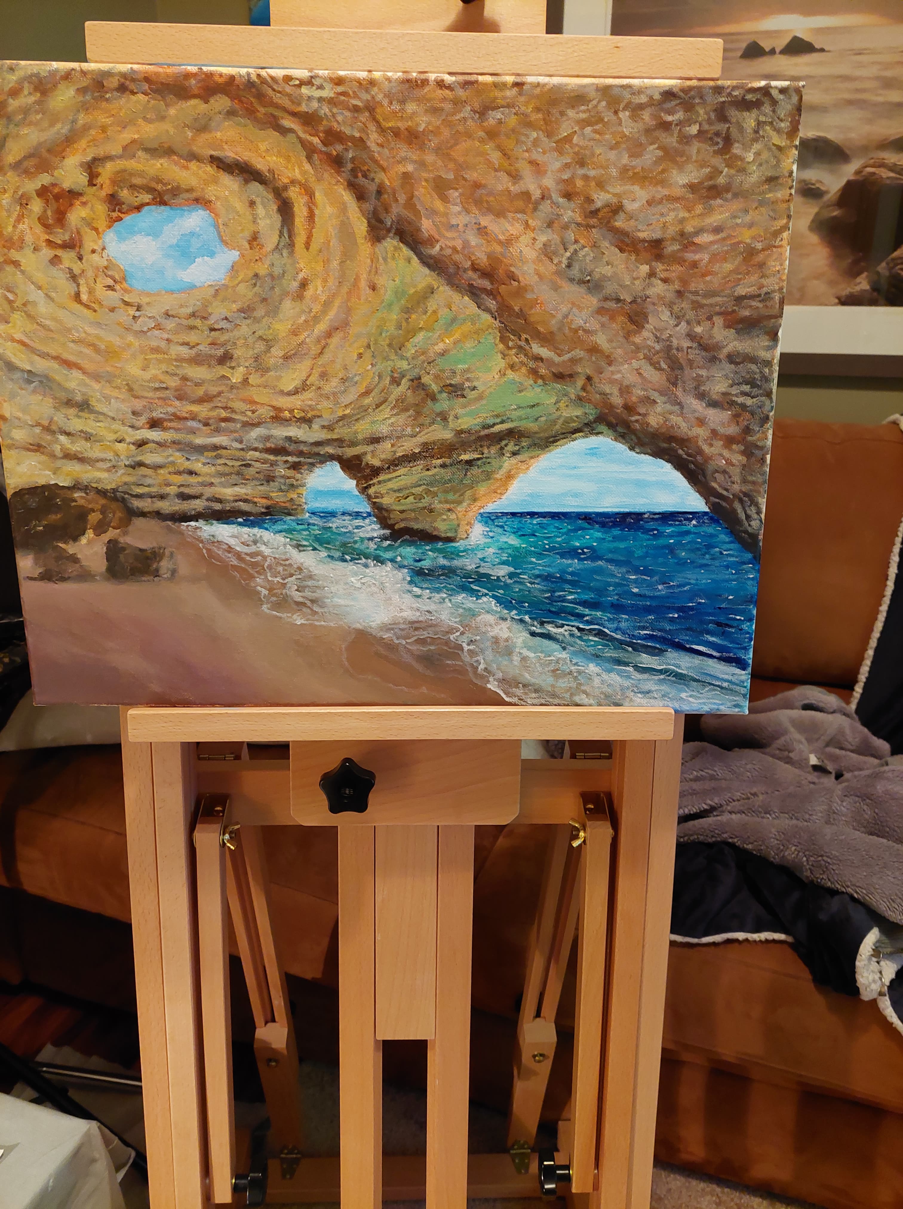 Location: caves, Portugal Dimensions: 16×12 inches Medium: Acrylic Paint on Canvas Price: $288 SOLD Description: A breathtaking view from within the Benagil sea cave, where natural rock formations frame a glimpse of turquoise waters and golden sand. The contrast between shadowed stone and sunlit ocean draws the eye outward. One of Vivian’es first paintings brings […]