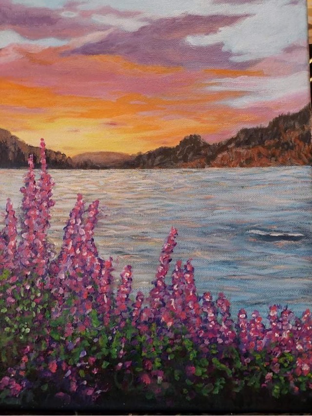 Location: Okanogan Falls, British Columbia, Canada Dimensions: 16×12 inches Medium: Acrylic Paint on Canvas Price: $288 SOLD Description: A tranquil lakeside scene unfolds beneath a radiant sunset, where vibrant pink and purple wildflowers bloom in the foreground. The calm waters of the lake mirror the warm hues of the sky—soft oranges, pinks, and purples—while distant […]