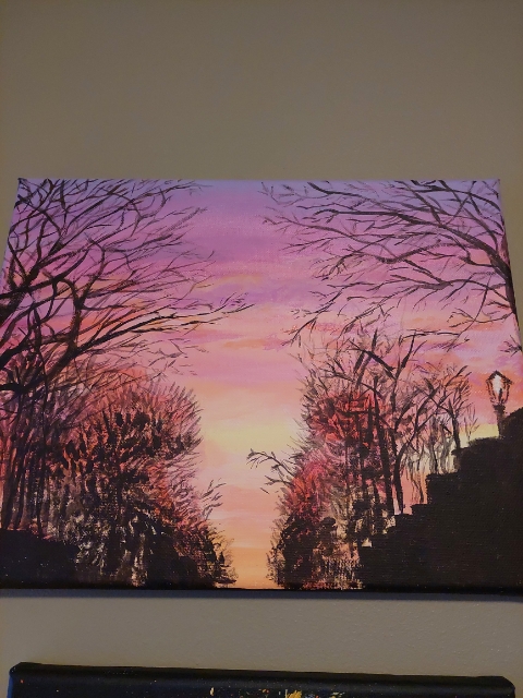 Location: Montreal, Quebec, Canada (2021) Dimensions: 16×12 inches Medium: Acrylic Paint on Canvas Price: $288 SOLD Description: A winding path flanked by bare trees leads into a sunset sky ablaze with warm gradients of pink, orange, and gold. The interplay between stark silhouettes and vibrant sky creates a compelling visual tension on this Montreal street […]