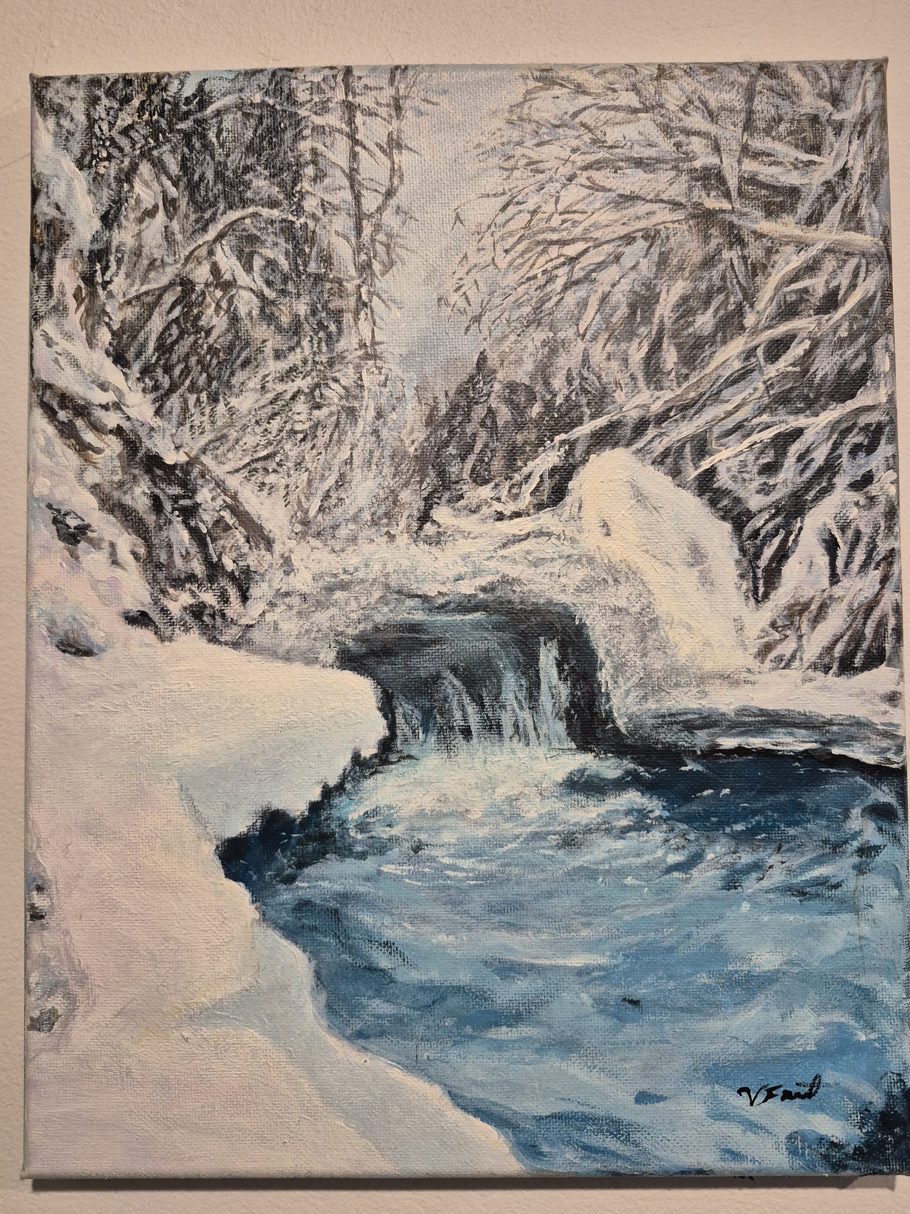 Location: Alaska, USA (2025) Dimensions: 16×12 inches Medium: Acrylic Paint on Canvas Price: $288 SOLD Description: A stark and dramatic winter landscape, featuring a rugged mountain partially cloaked in snow. A smaller, different vantage point to Forest’s larger Breath of Winter.Bare trees stand in quiet contrast to the icy blues and whites, creating a sense […]
