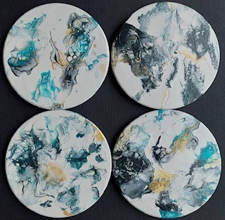 Fluid acrylic painting using multiple techniques such as blooming and palette knife. Sold as  a set of 4 ceramic tile coasters with cork backing and the top is  varnished.
