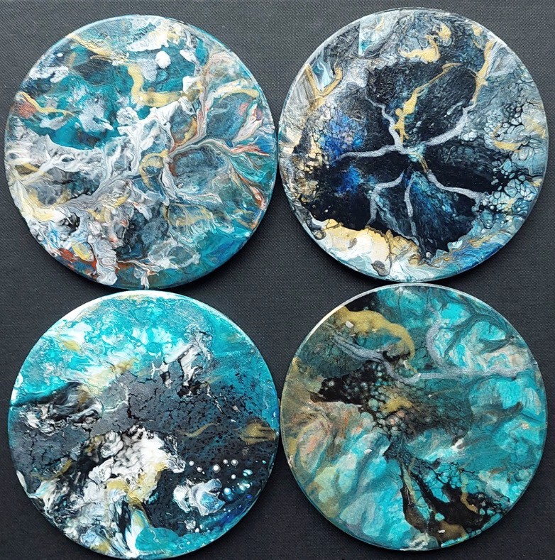 Fluid acrylic painting using multiple techniques such as blooming and palette knife. Sold as  a set of 4 ceramic tile coasters with cork backing and the top is  varnished.
